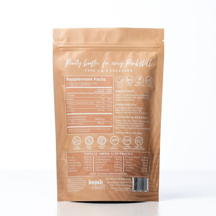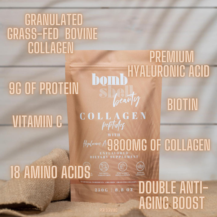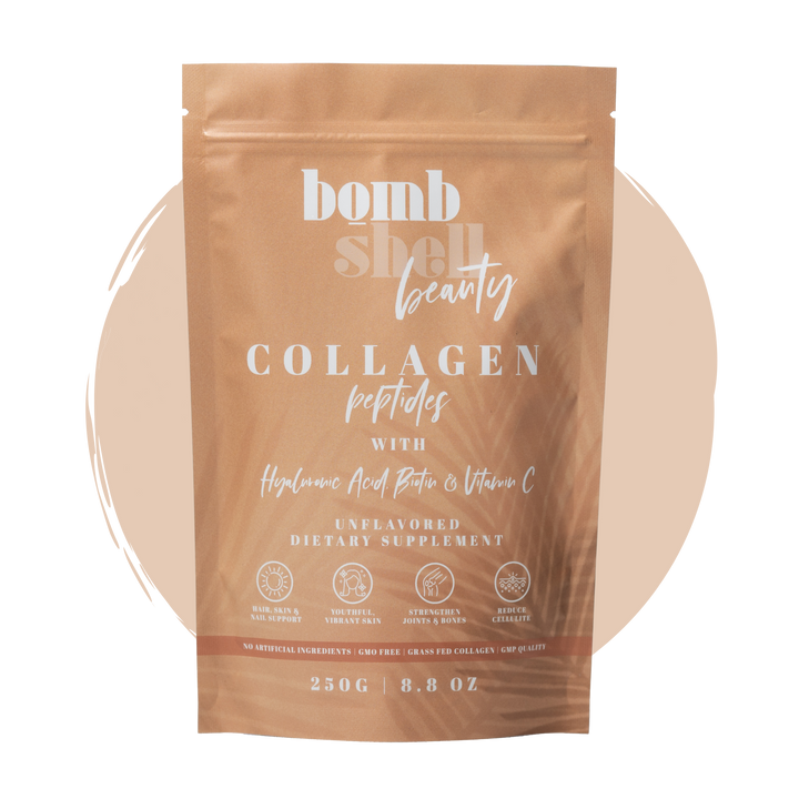 Bombshell uses collagen peptides from 100% pure grass-fed, pasture-raised bovine which are specially formulated to target hair, nail, and skin health, improve joint function and repair the gut. Hydrolyzed collagen is absorbed rapidly by the body to give you the best results.